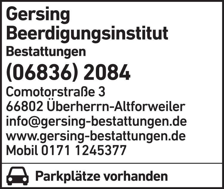 Sie suchen Gersing Beerdigungsinstitut in Altforweiler? Die vollständige Adresse sehen Sie mit eventuellen Öffnungszeiten hier auf dieser Seite. Sie brauchen diese Adresse häufiger? Dann speichern Sie sich doch Gersing Beerdigungsinstitut aus Überherrn-Altforweiler direkt als VCF-Datei für Ihr digitales Adressbuch mit allen Kontaktdaten. Ganz praktisch sind übrigens die kostenfreien Routen-Services für Überherrn: Lassen Sie sich die Adresse von Gersing Beerdigungsinstitut auf der Karte von Überherrn unter "Kartenansicht" anzeigen - inklusive Routenplaner. Hier können Sie sich mit der Funktion "Bahn/Bus" auch gleich die beste öffentliche Verbindung zu Gersing Beerdigungsinstitut in Überherrn während der jeweiligen Öffnungszeiten anzeigen lassen. So können Sie gut planen, wie lange Sie zu Gersing Beerdigungsinstitut brauchen und wann Sie sich auf den Weg machen sollten.
