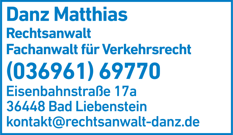 Sie sind auf der Suche nach Danz Matthias Rechtsanwaltskanzlei in Bad Liebenstein? Das Telefonbuch hilft weiter: Dort finden Sie Angaben wie die Adresse und die Öffnungszeiten. Um zu Danz Matthias Rechtsanwaltskanzlei zu kommen, können Sie einfach den praktischen Routenplaner nutzen: Er zeigt Ihnen nicht nur die schnellste Anfahrtsstrecke, sondern mit der Funktion "Bahn/Bus" können Sie sich die beste Verbindung mit den öffentlichen Verkehrsmitteln zu Danz Matthias Rechtsanwaltskanzlei in Bad Liebenstein anzeigen lassen. Schauen Sie am besten gleich nach Verbindungen innerhalb der Öffnungszeiten. Übrigens: Sie können die Adresse auch als VCF-Datei für Ihr digitales Adressbuch speichern, so dass Sie diese gleich parat haben für Ihren nächsten Besuch bei Danz Matthias Rechtsanwaltskanzlei in Bad Liebenstein. Und Sie können diese sogar per Mail oder SMS an Ihre Freunde oder Ihre Bekannten versenden, wenn Sie Danz Matthias Rechtsanwaltskanzlei weiterempfehlen möchten.