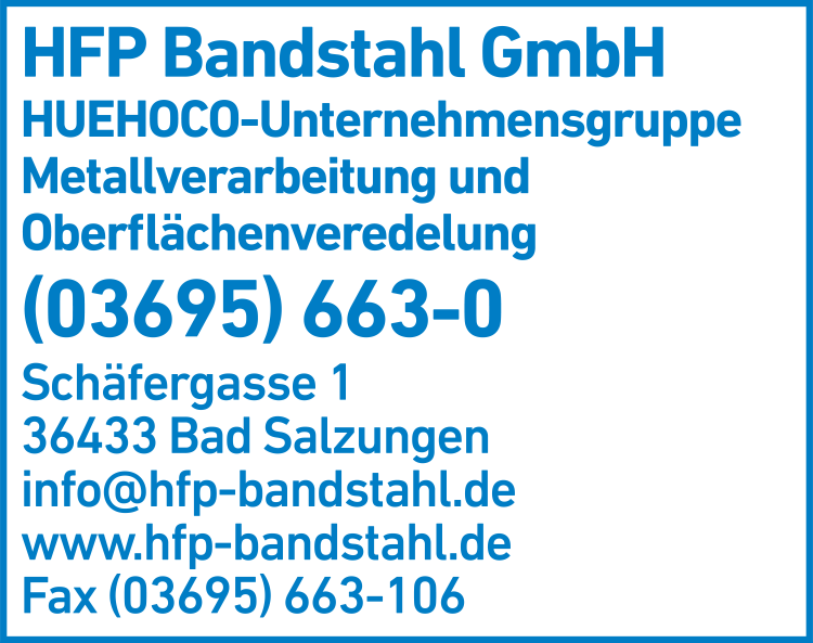 Sie sind auf der Suche nach HFP Bandstahl GmbH in Bad Salzungen? Das Telefonbuch hilft weiter: Dort finden Sie Angaben wie die Adresse und die Öffnungszeiten. Um zu HFP Bandstahl GmbH zu kommen, können Sie einfach den praktischen Routenplaner nutzen: Er zeigt Ihnen nicht nur die schnellste Anfahrtsstrecke, sondern mit der Funktion "Bahn/Bus" können Sie sich die beste Verbindung mit den öffentlichen Verkehrsmitteln zu HFP Bandstahl GmbH in Bad Salzungen anzeigen lassen. Schauen Sie am besten gleich nach Verbindungen innerhalb der Öffnungszeiten. Übrigens: Sie können die Adresse auch als VCF-Datei für Ihr digitales Adressbuch speichern, so dass Sie diese gleich parat haben für Ihren nächsten Besuch bei HFP Bandstahl GmbH in Bad Salzungen. Und Sie können diese sogar per Mail oder SMS an Ihre Freunde oder Ihre Bekannten versenden, wenn Sie HFP Bandstahl GmbH weiterempfehlen möchten.