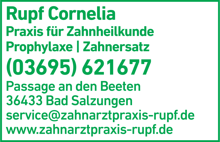 Wenn Sie Rupf Cornelia Zahnarztpraxis in Bad Salzungen anrufen möchten, erreichen Sie Ihren Ansprechpartner unter der Telefonnummer 03695 62 16 77 zu den jeweiligen Öffnungszeiten. Um zu Rupf Cornelia Zahnarztpraxis in Bad Salzungen zu gelangen, nutzen Sie am besten die kostenfreien Routen-Services: Diese zeigen Ihnen die Adresse von Rupf Cornelia Zahnarztpraxis auf der Karte von Bad Salzungen unter "Kartenansicht" an und erleichtern Ihnen dank des Routenplaners die Anfahrt. Ganz praktisch ist hierbei die Funktion "Bahn/Bus", die Ihnen die beste öffentliche Verbindung zu Rupf Cornelia Zahnarztpraxis in Bad Salzungen während der Öffnungszeiten anzeigt. Sie sind häufiger dort? Dann speichern Sie sich doch die Adresse gleich als VCF-Datei für Ihr digitales Adressbuch oder versenden Sie die Kontaktdaten an Bekannte, wenn Sie Rupf Cornelia Zahnarztpraxis weiterempfehlen möchten.