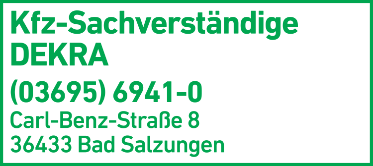 Wenn Sie DEKRA Kfz-Sachverständige in Bad Salzungen anrufen möchten, erreichen Sie Ihren Ansprechpartner unter der Telefonnummer 03695 69 41-0 zu den jeweiligen Öffnungszeiten. Um zu DEKRA Kfz-Sachverständige in Bad Salzungen zu gelangen, nutzen Sie am besten die kostenfreien Routen-Services: Diese zeigen Ihnen die Adresse von DEKRA Kfz-Sachverständige auf der Karte von Bad Salzungen unter "Kartenansicht" an und erleichtern Ihnen dank des Routenplaners die Anfahrt. Ganz praktisch ist hierbei die Funktion "Bahn/Bus", die Ihnen die beste öffentliche Verbindung zu DEKRA Kfz-Sachverständige in Bad Salzungen während der Öffnungszeiten anzeigt. Sie sind häufiger dort? Dann speichern Sie sich doch die Adresse gleich als VCF-Datei für Ihr digitales Adressbuch oder versenden Sie die Kontaktdaten an Bekannte, wenn Sie DEKRA Kfz-Sachverständige weiterempfehlen möchten.