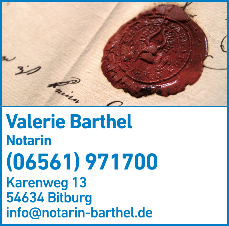 Sie sind auf der Suche nach Barthel Valerie Notarin in Bitburg? Das Telefonbuch hilft weiter: Dort finden Sie Angaben wie die Adresse und die Öffnungszeiten. Um zu Barthel Valerie Notarin zu kommen, können Sie einfach den praktischen Routenplaner nutzen: Er zeigt Ihnen nicht nur die schnellste Anfahrtsstrecke, sondern mit der Funktion "Bahn/Bus" können Sie sich die beste Verbindung mit den öffentlichen Verkehrsmitteln zu Barthel Valerie Notarin in Bitburg anzeigen lassen. Schauen Sie am besten gleich nach Verbindungen innerhalb der Öffnungszeiten. Übrigens: Sie können die Adresse auch als VCF-Datei für Ihr digitales Adressbuch speichern, so dass Sie diese gleich parat haben für Ihren nächsten Besuch bei Barthel Valerie Notarin in Bitburg. Und Sie können diese sogar per Mail oder SMS an Ihre Freunde oder Ihre Bekannten versenden, wenn Sie Barthel Valerie Notarin weiterempfehlen möchten.