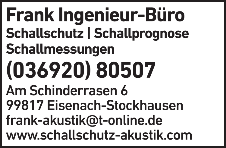 Wenn Sie Frank Ingenieurbüro Schallschutz in Eisenach anrufen möchten, erreichen Sie Ihren Ansprechpartner unter der Telefonnummer 036920 8 05 07 zu den jeweiligen Öffnungszeiten. Um zu Frank Ingenieurbüro Schallschutz in Eisenach zu gelangen, nutzen Sie am besten die kostenfreien Routen-Services: Diese zeigen Ihnen die Adresse von Frank Ingenieurbüro Schallschutz auf der Karte von Eisenach unter "Kartenansicht" an und erleichtern Ihnen dank des Routenplaners die Anfahrt. Ganz praktisch ist hierbei die Funktion "Bahn/Bus", die Ihnen die beste öffentliche Verbindung zu Frank Ingenieurbüro Schallschutz in Eisenach während der Öffnungszeiten anzeigt. Sie sind häufiger dort? Dann speichern Sie sich doch die Adresse gleich als VCF-Datei für Ihr digitales Adressbuch oder versenden Sie die Kontaktdaten an Bekannte, wenn Sie Frank Ingenieurbüro Schallschutz weiterempfehlen möchten.
