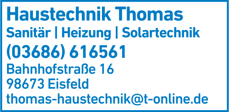 Wenn Sie Thomas Björn Haustechnik in Eisfeld anrufen möchten, erreichen Sie Ihren Ansprechpartner unter der Telefonnummer 03686 61 65 61 zu den jeweiligen Öffnungszeiten. Um zu Thomas Björn Haustechnik in Eisfeld zu gelangen, nutzen Sie am besten die kostenfreien Routen-Services: Diese zeigen Ihnen die Adresse von Thomas Björn Haustechnik auf der Karte von Eisfeld unter "Kartenansicht" an und erleichtern Ihnen dank des Routenplaners die Anfahrt. Ganz praktisch ist hierbei die Funktion "Bahn/Bus", die Ihnen die beste öffentliche Verbindung zu Thomas Björn Haustechnik in Eisfeld während der Öffnungszeiten anzeigt. Sie sind häufiger dort? Dann speichern Sie sich doch die Adresse gleich als VCF-Datei für Ihr digitales Adressbuch oder versenden Sie die Kontaktdaten an Bekannte, wenn Sie Thomas Björn Haustechnik weiterempfehlen möchten.