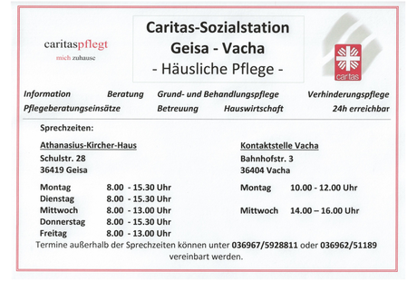 Sie sind auf der Suche nach Caritas Sozialstation in Geisa? Das Telefonbuch hilft weiter: Dort finden Sie Angaben wie die Adresse und die Öffnungszeiten. Um zu Caritas Sozialstation zu kommen, können Sie einfach den praktischen Routenplaner nutzen: Er zeigt Ihnen nicht nur die schnellste Anfahrtsstrecke, sondern mit der Funktion "Bahn/Bus" können Sie sich die beste Verbindung mit den öffentlichen Verkehrsmitteln zu Caritas Sozialstation in Geisa anzeigen lassen. Schauen Sie am besten gleich nach Verbindungen innerhalb der Öffnungszeiten. Übrigens: Sie können die Adresse auch als VCF-Datei für Ihr digitales Adressbuch speichern, so dass Sie diese gleich parat haben für Ihren nächsten Besuch bei Caritas Sozialstation in Geisa. Und Sie können diese sogar per Mail oder SMS an Ihre Freunde oder Ihre Bekannten versenden, wenn Sie Caritas Sozialstation weiterempfehlen möchten.