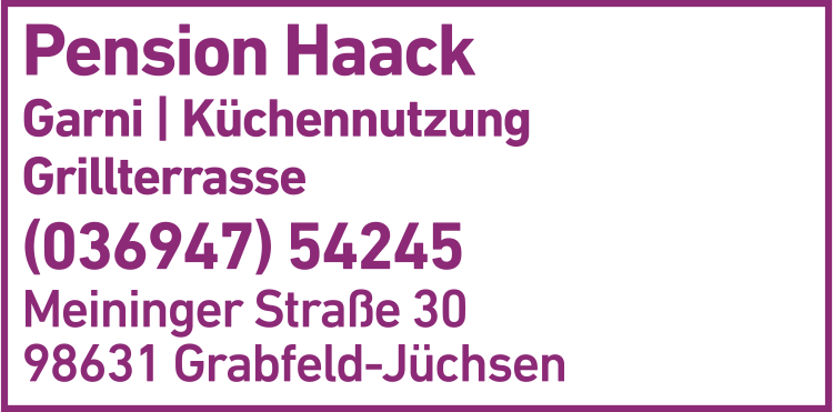 Haack Rita Pension in Grabfeld-Jüchsen erreichen Sie unter der Telefonnummer 036947 5 42 45. Während der Öffnungszeiten hilft man Ihnen dort gerne weiter. Sie möchten Haack Rita Pension an Bekannte oder Freunde weiterempfehlen? Sie können die Kontaktdaten einfach per Mail oder SMS versenden und auch als VCF-Datei für Ihr eigenes digitales Adressbuch speichern. Für Ihren Besuch bei Haack Rita Pension nutzen Sie am besten die kostenfreien Routen-Services für Grabfeld: Lassen Sie sich die Adresse von Haack Rita Pension auf der Karte von Grabfeld unter "Kartenansicht" inklusive Routenplaner anzeigen oder suchen Sie mit der praktischen Funktion "Bahn/Bus" die beste öffentliche Verbindung zu Haack Rita Pension in Grabfeld.
