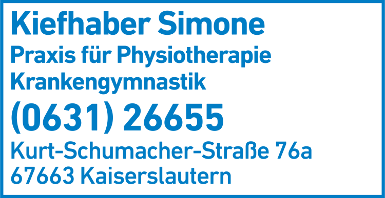 Sie sind auf der Suche nach Kiefhaber Simone Krankengymnastik in Kaiserslautern? Das Telefonbuch hilft weiter: Dort finden Sie Angaben wie die Adresse und die Öffnungszeiten. Um zu Kiefhaber Simone Krankengymnastik zu kommen, können Sie einfach den praktischen Routenplaner nutzen: Er zeigt Ihnen nicht nur die schnellste Anfahrtsstrecke, sondern mit der Funktion "Bahn/Bus" können Sie sich die beste Verbindung mit den öffentlichen Verkehrsmitteln zu Kiefhaber Simone Krankengymnastik in Kaiserslautern anzeigen lassen. Schauen Sie am besten gleich nach Verbindungen innerhalb der Öffnungszeiten. Übrigens: Sie können die Adresse auch als VCF-Datei für Ihr digitales Adressbuch speichern, so dass Sie diese gleich parat haben für Ihren nächsten Besuch bei Kiefhaber Simone Krankengymnastik in Kaiserslautern. Und Sie können diese sogar per Mail oder SMS an Ihre Freunde oder Ihre Bekannten versenden, wenn Sie Kiefhaber Simone Krankengymnastik weiterempfehlen möchten.
