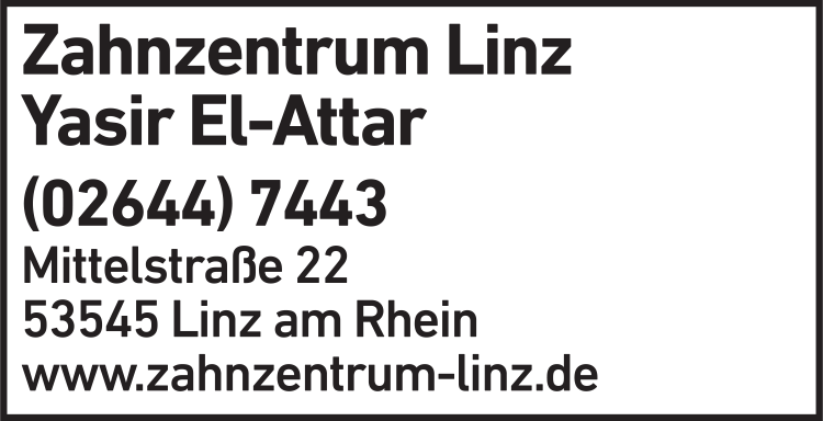 Wenn Sie Zahnzentrum Linz Yasir El-Attar in Linz am Rhein anrufen möchten, erreichen Sie Ihren Ansprechpartner unter der Telefonnummer 02644 74 43 zu den jeweiligen Öffnungszeiten. Um zu Zahnzentrum Linz Yasir El-Attar in Linz am Rhein zu gelangen, nutzen Sie am besten die kostenfreien Routen-Services: Diese zeigen Ihnen die Adresse von Zahnzentrum Linz Yasir El-Attar auf der Karte von Linz am Rhein unter "Kartenansicht" an und erleichtern Ihnen dank des Routenplaners die Anfahrt. Ganz praktisch ist hierbei die Funktion "Bahn/Bus", die Ihnen die beste öffentliche Verbindung zu Zahnzentrum Linz Yasir El-Attar in Linz am Rhein während der Öffnungszeiten anzeigt. Sie sind häufiger dort? Dann speichern Sie sich doch die Adresse gleich als VCF-Datei für Ihr digitales Adressbuch oder versenden Sie die Kontaktdaten an Bekannte, wenn Sie Zahnzentrum Linz Yasir El-Attar weiterempfehlen möchten.