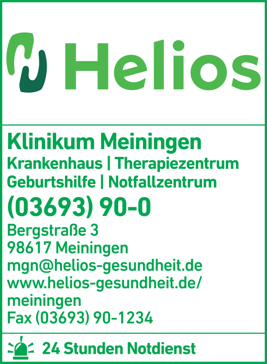 Sie suchen Helios Klinikum Meiningen in Dreißigacker? Die vollständige Adresse sehen Sie mit eventuellen Öffnungszeiten hier auf dieser Seite. Sie brauchen diese Adresse häufiger? Dann speichern Sie sich doch Helios Klinikum Meiningen aus Meiningen-Dreißigacker direkt als VCF-Datei für Ihr digitales Adressbuch mit allen Kontaktdaten. Ganz praktisch sind übrigens die kostenfreien Routen-Services für Meiningen: Lassen Sie sich die Adresse von Helios Klinikum Meiningen auf der Karte von Meiningen unter "Kartenansicht" anzeigen - inklusive Routenplaner. Hier können Sie sich mit der Funktion "Bahn/Bus" auch gleich die beste öffentliche Verbindung zu Helios Klinikum Meiningen in Meiningen während der jeweiligen Öffnungszeiten anzeigen lassen. So können Sie gut planen, wie lange Sie zu Helios Klinikum Meiningen brauchen und wann Sie sich auf den Weg machen sollten.