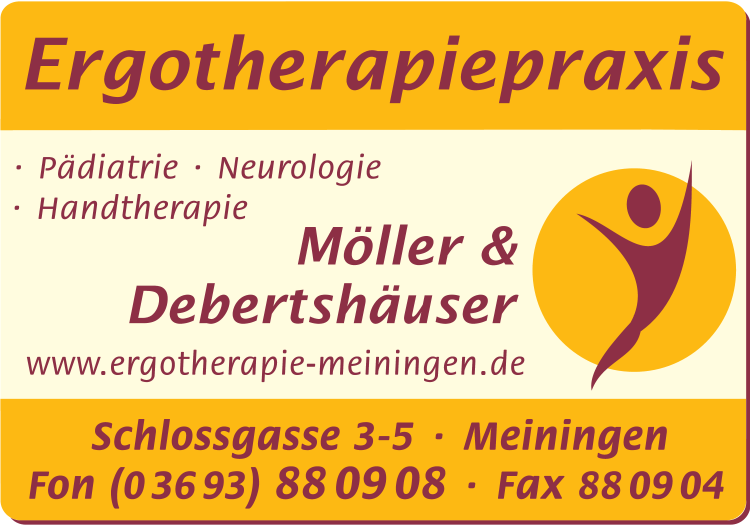 Sie sind auf der Suche nach Solveig Möller & Kerstin Debertshäuser GmbH Ergotherapiepraxis in Meiningen? Das Telefonbuch hilft weiter: Dort finden Sie Angaben wie die Adresse und die Öffnungszeiten. Um zu Solveig Möller & Kerstin Debertshäuser GmbH Ergotherapiepraxis zu kommen, können Sie einfach den praktischen Routenplaner nutzen: Er zeigt Ihnen nicht nur die schnellste Anfahrtsstrecke, sondern mit der Funktion "Bahn/Bus" können Sie sich die beste Verbindung mit den öffentlichen Verkehrsmitteln zu Solveig Möller & Kerstin Debertshäuser GmbH Ergotherapiepraxis in Meiningen anzeigen lassen. Schauen Sie am besten gleich nach Verbindungen innerhalb der Öffnungszeiten. Übrigens: Sie können die Adresse auch als VCF-Datei für Ihr digitales Adressbuch speichern, so dass Sie diese gleich parat haben für Ihren nächsten Besuch bei Solveig Möller & Kerstin Debertshäuser GmbH Ergotherapiepraxis in Meiningen. Und Sie können diese sogar per Mail oder SMS an Ihre Freunde oder Ihre Bekannten versenden, wenn Sie Solveig Möller & Kerstin Debertshäuser GmbH Ergotherapiepraxis weiterempfehlen möchten.
