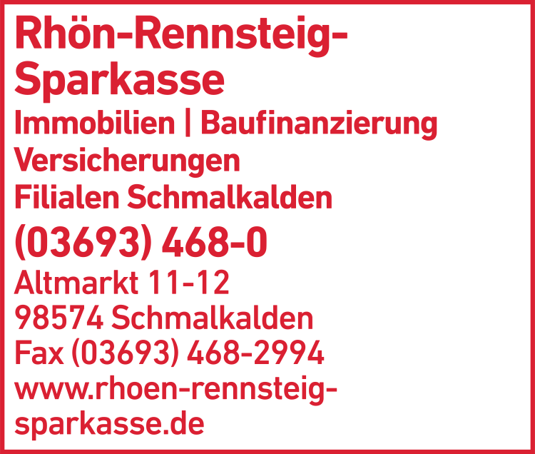 Sie sind auf der Suche nach Rhön-Rennsteig Sparkasse in Schmalkalden? Das Telefonbuch hilft weiter: Dort finden Sie Angaben wie die Adresse und die Öffnungszeiten. Um zu Rhön-Rennsteig Sparkasse zu kommen, können Sie einfach den praktischen Routenplaner nutzen: Er zeigt Ihnen nicht nur die schnellste Anfahrtsstrecke, sondern mit der Funktion "Bahn/Bus" können Sie sich die beste Verbindung mit den öffentlichen Verkehrsmitteln zu Rhön-Rennsteig Sparkasse in Schmalkalden anzeigen lassen. Schauen Sie am besten gleich nach Verbindungen innerhalb der Öffnungszeiten. Übrigens: Sie können die Adresse auch als VCF-Datei für Ihr digitales Adressbuch speichern, so dass Sie diese gleich parat haben für Ihren nächsten Besuch bei Rhön-Rennsteig Sparkasse in Schmalkalden. Und Sie können diese sogar per Mail oder SMS an Ihre Freunde oder Ihre Bekannten versenden, wenn Sie Rhön-Rennsteig Sparkasse weiterempfehlen möchten.
