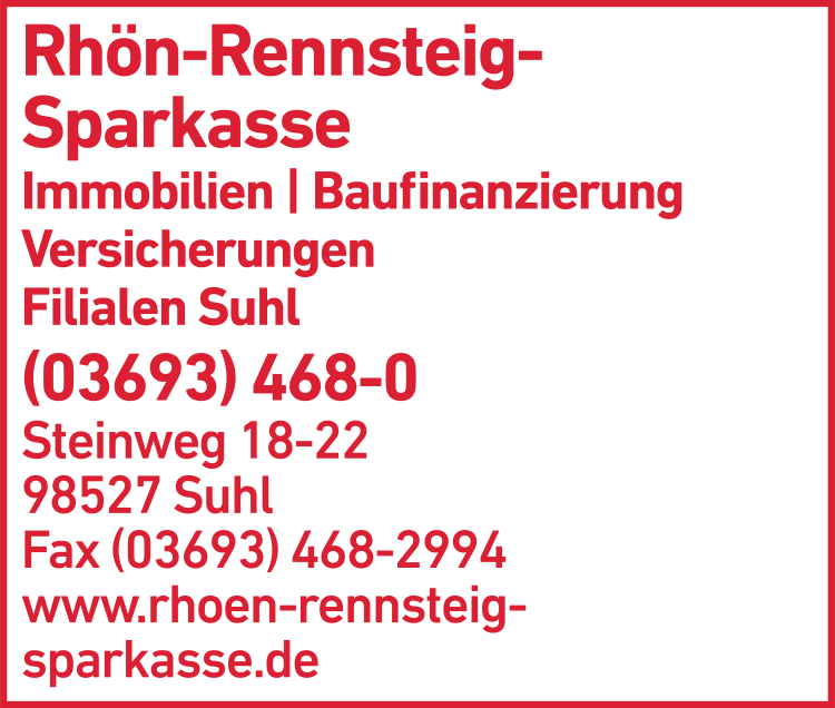 Sie sind auf der Suche nach Rhön-Rennsteig Sparkasse in Suhl? Das Telefonbuch hilft weiter: Dort finden Sie Angaben wie die Adresse und die Öffnungszeiten. Um zu Rhön-Rennsteig Sparkasse zu kommen, können Sie einfach den praktischen Routenplaner nutzen: Er zeigt Ihnen nicht nur die schnellste Anfahrtsstrecke, sondern mit der Funktion "Bahn/Bus" können Sie sich die beste Verbindung mit den öffentlichen Verkehrsmitteln zu Rhön-Rennsteig Sparkasse in Suhl anzeigen lassen. Schauen Sie am besten gleich nach Verbindungen innerhalb der Öffnungszeiten. Übrigens: Sie können die Adresse auch als VCF-Datei für Ihr digitales Adressbuch speichern, so dass Sie diese gleich parat haben für Ihren nächsten Besuch bei Rhön-Rennsteig Sparkasse in Suhl. Und Sie können diese sogar per Mail oder SMS an Ihre Freunde oder Ihre Bekannten versenden, wenn Sie Rhön-Rennsteig Sparkasse weiterempfehlen möchten.