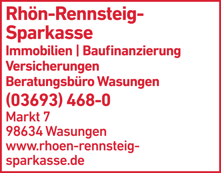 Wenn Sie Rhön-Rennsteig Sparkasse in Wasungen anrufen möchten, erreichen Sie Ihren Ansprechpartner unter der Telefonnummer 03693 4 68-0 zu den jeweiligen Öffnungszeiten. Um zu Rhön-Rennsteig Sparkasse in Wasungen zu gelangen, nutzen Sie am besten die kostenfreien Routen-Services: Diese zeigen Ihnen die Adresse von Rhön-Rennsteig Sparkasse auf der Karte von Wasungen unter "Kartenansicht" an und erleichtern Ihnen dank des Routenplaners die Anfahrt. Ganz praktisch ist hierbei die Funktion "Bahn/Bus", die Ihnen die beste öffentliche Verbindung zu Rhön-Rennsteig Sparkasse in Wasungen während der Öffnungszeiten anzeigt. Sie sind häufiger dort? Dann speichern Sie sich doch die Adresse gleich als VCF-Datei für Ihr digitales Adressbuch oder versenden Sie die Kontaktdaten an Bekannte, wenn Sie Rhön-Rennsteig Sparkasse weiterempfehlen möchten.