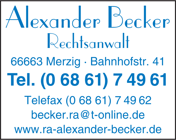 Sie sind auf der Suche nach Becker Alexander Rechtsanwalt in Merzig? Das Telefonbuch hilft weiter: Dort finden Sie Angaben wie die Adresse und die Öffnungszeiten. Um zu Becker Alexander Rechtsanwalt zu kommen, können Sie einfach den praktischen Routenplaner nutzen: Er zeigt Ihnen nicht nur die schnellste Anfahrtsstrecke, sondern mit der Funktion "Bahn/Bus" können Sie sich die beste Verbindung mit den öffentlichen Verkehrsmitteln zu Becker Alexander Rechtsanwalt in Merzig anzeigen lassen. Schauen Sie am besten gleich nach Verbindungen innerhalb der Öffnungszeiten. Übrigens: Sie können die Adresse auch als VCF-Datei für Ihr digitales Adressbuch speichern, so dass Sie diese gleich parat haben für Ihren nächsten Besuch bei Becker Alexander Rechtsanwalt in Merzig. Und Sie können diese sogar per Mail oder SMS an Ihre Freunde oder Ihre Bekannten versenden, wenn Sie Becker Alexander Rechtsanwalt weiterempfehlen möchten.