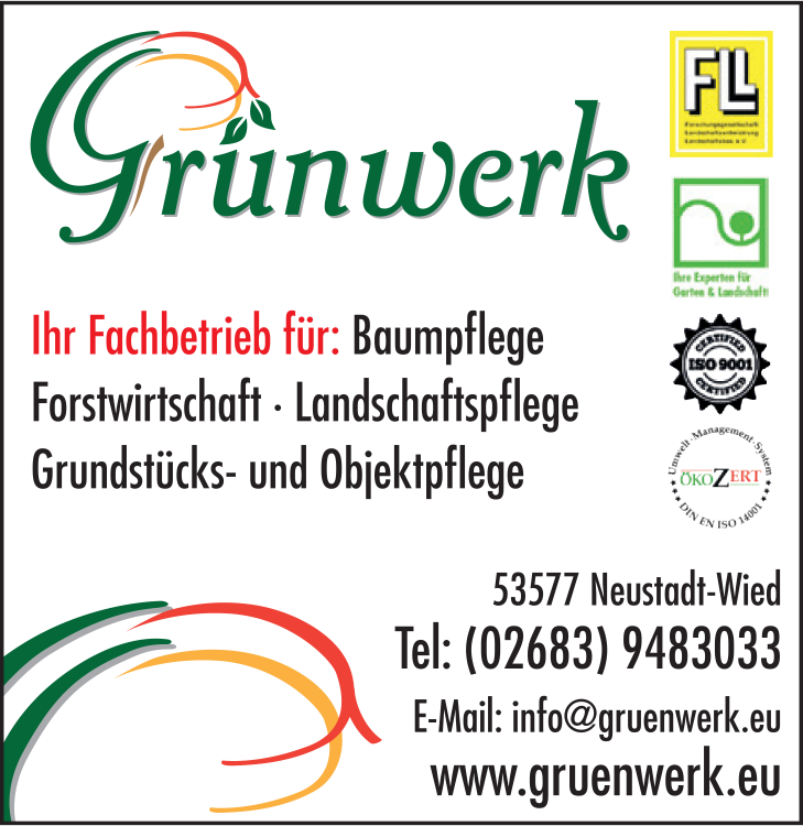 Wenn Sie Grünwerk, Inh. Philipp Maxeiner Baumpflege, Fortswirtschaft in Neustadt (Wied) anrufen möchten, erreichen Sie Ihren Ansprechpartner unter der Telefonnummer 02683 9 48 30 33 zu den jeweiligen Öffnungszeiten. Um zu Grünwerk, Inh. Philipp Maxeiner Baumpflege, Fortswirtschaft in Neustadt (Wied) zu gelangen, nutzen Sie am besten die kostenfreien Routen-Services: Diese zeigen Ihnen die Adresse von Grünwerk, Inh. Philipp Maxeiner Baumpflege, Fortswirtschaft auf der Karte von Neustadt (Wied) unter "Kartenansicht" an und erleichtern Ihnen dank des Routenplaners die Anfahrt. Ganz praktisch ist hierbei die Funktion "Bahn/Bus", die Ihnen die beste öffentliche Verbindung zu Grünwerk, Inh. Philipp Maxeiner Baumpflege, Fortswirtschaft in Neustadt (Wied) während der Öffnungszeiten anzeigt. Sie sind häufiger dort? Dann speichern Sie sich doch die Adresse gleich als VCF-Datei für Ihr digitales Adressbuch oder versenden Sie die Kontaktdaten an Bekannte, wenn Sie Grünwerk, Inh. Philipp Maxeiner Baumpflege, Fortswirtschaft weiterempfehlen möchten.
