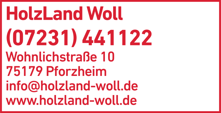 Wenn Sie HolzLand Woll GmbH & Co. KG in Pforzheim anrufen möchten, erreichen Sie Ihren Ansprechpartner unter der Telefonnummer 07231 44 11 22 zu den jeweiligen Öffnungszeiten. Um zu HolzLand Woll GmbH & Co. KG in Pforzheim zu gelangen, nutzen Sie am besten die kostenfreien Routen-Services: Diese zeigen Ihnen die Adresse von HolzLand Woll GmbH & Co. KG auf der Karte von Pforzheim unter "Kartenansicht" an und erleichtern Ihnen dank des Routenplaners die Anfahrt. Ganz praktisch ist hierbei die Funktion "Bahn/Bus", die Ihnen die beste öffentliche Verbindung zu HolzLand Woll GmbH & Co. KG in Pforzheim während der Öffnungszeiten anzeigt. Sie sind häufiger dort? Dann speichern Sie sich doch die Adresse gleich als VCF-Datei für Ihr digitales Adressbuch oder versenden Sie die Kontaktdaten an Bekannte, wenn Sie HolzLand Woll GmbH & Co. KG weiterempfehlen möchten.