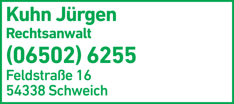 Wenn Sie Kuhn Jürgen Rechtsanwalt in Schweich anrufen möchten, erreichen Sie Ihren Ansprechpartner unter der Telefonnummer 06502 62 55 zu den jeweiligen Öffnungszeiten. Um zu Kuhn Jürgen Rechtsanwalt in Schweich zu gelangen, nutzen Sie am besten die kostenfreien Routen-Services: Diese zeigen Ihnen die Adresse von Kuhn Jürgen Rechtsanwalt auf der Karte von Schweich unter "Kartenansicht" an und erleichtern Ihnen dank des Routenplaners die Anfahrt. Ganz praktisch ist hierbei die Funktion "Bahn/Bus", die Ihnen die beste öffentliche Verbindung zu Kuhn Jürgen Rechtsanwalt in Schweich während der Öffnungszeiten anzeigt. Sie sind häufiger dort? Dann speichern Sie sich doch die Adresse gleich als VCF-Datei für Ihr digitales Adressbuch oder versenden Sie die Kontaktdaten an Bekannte, wenn Sie Kuhn Jürgen Rechtsanwalt weiterempfehlen möchten.