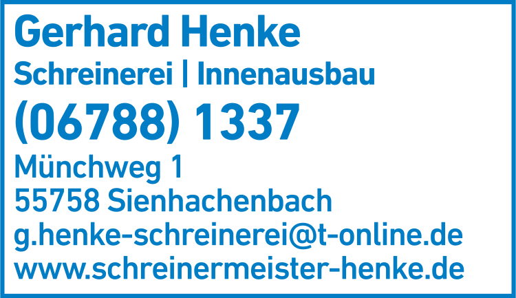 Sie sind auf der Suche nach Henke Gerhard Schreinerei in Sienhachenbach? Das Telefonbuch hilft weiter: Dort finden Sie Angaben wie die Adresse und die Öffnungszeiten. Um zu Henke Gerhard Schreinerei zu kommen, können Sie einfach den praktischen Routenplaner nutzen: Er zeigt Ihnen nicht nur die schnellste Anfahrtsstrecke, sondern mit der Funktion "Bahn/Bus" können Sie sich die beste Verbindung mit den öffentlichen Verkehrsmitteln zu Henke Gerhard Schreinerei in Sienhachenbach anzeigen lassen. Schauen Sie am besten gleich nach Verbindungen innerhalb der Öffnungszeiten. Übrigens: Sie können die Adresse auch als VCF-Datei für Ihr digitales Adressbuch speichern, so dass Sie diese gleich parat haben für Ihren nächsten Besuch bei Henke Gerhard Schreinerei in Sienhachenbach. Und Sie können diese sogar per Mail oder SMS an Ihre Freunde oder Ihre Bekannten versenden, wenn Sie Henke Gerhard Schreinerei weiterempfehlen möchten.