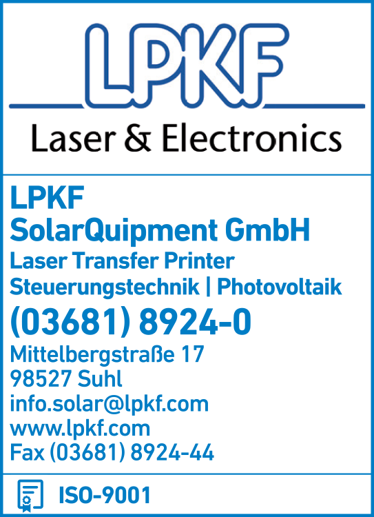 Sie sind auf der Suche nach LPKF SolarQuipment GmbH in Suhl? Das Telefonbuch hilft weiter: Dort finden Sie Angaben wie die Adresse und die Öffnungszeiten. Um zu LPKF SolarQuipment GmbH zu kommen, können Sie einfach den praktischen Routenplaner nutzen: Er zeigt Ihnen nicht nur die schnellste Anfahrtsstrecke, sondern mit der Funktion "Bahn/Bus" können Sie sich die beste Verbindung mit den öffentlichen Verkehrsmitteln zu LPKF SolarQuipment GmbH in Suhl anzeigen lassen. Schauen Sie am besten gleich nach Verbindungen innerhalb der Öffnungszeiten. Übrigens: Sie können die Adresse auch als VCF-Datei für Ihr digitales Adressbuch speichern, so dass Sie diese gleich parat haben für Ihren nächsten Besuch bei LPKF SolarQuipment GmbH in Suhl. Und Sie können diese sogar per Mail oder SMS an Ihre Freunde oder Ihre Bekannten versenden, wenn Sie LPKF SolarQuipment GmbH weiterempfehlen möchten.