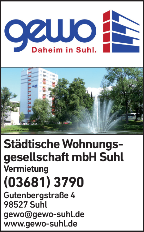 Städtisches Wohnungsunternehmen GeWo - günstig wohnen in Suhl. Sie suchen eine Mietwohnung in Suhl oder möchten hier eine Eigentumswohnung kaufen? Dann sind Sie bei uns an der richtigen Adresse. Als kommunale Wohnungsgesellschaft bieten wir Ihnen zahlreiche preiswerte Wohnungen im gesamten Stadtgebiet. Für Vermietungen von Gewerberäumen, Garagen und Stellplätzen sind wir ebenfalls der perfekte Ansprechpartner. Unser Wohnungsunternehmen verfügt über einen breit gefächerten Wohnungsbestand, den wir mit Neubauten ständig erweitern. Unsere Aktivitäten erstrecken sich auf zahlreiche Stadtteile in Suhl: Zu unserer Angebotspalette gehören Mietwohnungen in der Stadtmitte, Suhl-Nord, Aue und Lautenberg. Zugleich zeichnen wir uns durch eine große Vielfalt an Wohnungen aus. Unser Portfolio umfasst günstige Einzimmerwohnungen für Singles, geräumige Mietwohnungen für Familien und barrierefreie Objekte für Senioren. Wir engagieren uns auch im Bereich des betreuten Wohnens . Als städtische Wohnungsgesellschaft liegen uns soziale Aspekte und die Stadtentwicklung am Herzen. Wir ermöglichen allen Menschen in Suhl bezahlbares Wohnen . Darüber hinaus investieren wir erhebliche Summen in die Sanierung unserer Mietwohnungen: Das kommt gleichermaßen den Mietern und dem Stadtbild zugute. Beachten Sie auch unser attraktives Angebot an Eigentumswohnungen und Baugrundstücken . Selbstständige finden bei uns ebenfalls geeignete Objekte.