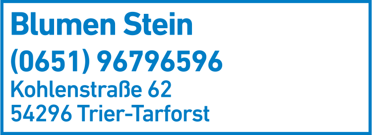 Kaumanns Norbert - Blumen Stein Blumenladen in Trier-Kürenz erreichen Sie unter der Telefonnummer 0651 96 79 65 96. Während der Öffnungszeiten hilft man Ihnen dort gerne weiter. Sie möchten Kaumanns Norbert - Blumen Stein Blumenladen an Bekannte oder Freunde weiterempfehlen? Sie können die Kontaktdaten einfach per Mail oder SMS versenden und auch als VCF-Datei für Ihr eigenes digitales Adressbuch speichern. Für Ihren Besuch bei Kaumanns Norbert - Blumen Stein Blumenladen nutzen Sie am besten die kostenfreien Routen-Services für Trier: Lassen Sie sich die Adresse von Kaumanns Norbert - Blumen Stein Blumenladen auf der Karte von Trier unter "Kartenansicht" inklusive Routenplaner anzeigen oder suchen Sie mit der praktischen Funktion "Bahn/Bus" die beste öffentliche Verbindung zu Kaumanns Norbert - Blumen Stein Blumenladen in Trier.