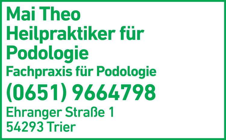 Mai Theo Fachpraxis für Podologie in Trier-Ehrang erreichen Sie unter der Telefonnummer 0651 9 66 47 98. Während der Öffnungszeiten hilft man Ihnen dort gerne weiter. Sie möchten Mai Theo Fachpraxis für Podologie an Bekannte oder Freunde weiterempfehlen? Sie können die Kontaktdaten einfach per Mail oder SMS versenden und auch als VCF-Datei für Ihr eigenes digitales Adressbuch speichern. Für Ihren Besuch bei Mai Theo Fachpraxis für Podologie nutzen Sie am besten die kostenfreien Routen-Services für Trier: Lassen Sie sich die Adresse von Mai Theo Fachpraxis für Podologie auf der Karte von Trier unter "Kartenansicht" inklusive Routenplaner anzeigen oder suchen Sie mit der praktischen Funktion "Bahn/Bus" die beste öffentliche Verbindung zu Mai Theo Fachpraxis für Podologie in Trier.