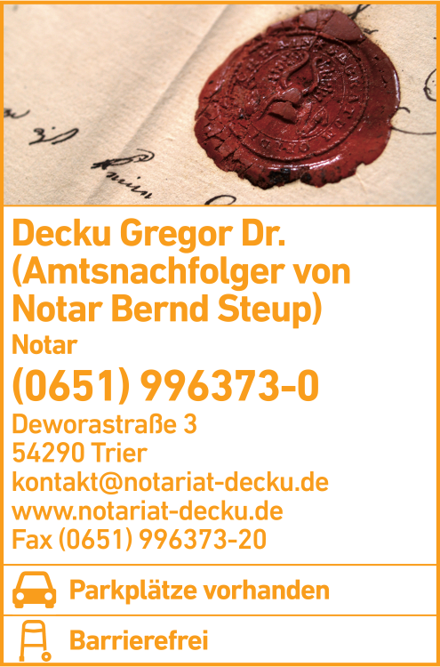 Sie sind auf der Suche nach Decku Gregor Dr. Notar in Trier? Das Telefonbuch hilft weiter: Dort finden Sie Angaben wie die Adresse und die Öffnungszeiten. Um zu Decku Gregor Dr. Notar zu kommen, können Sie einfach den praktischen Routenplaner nutzen: Er zeigt Ihnen nicht nur die schnellste Anfahrtsstrecke, sondern mit der Funktion "Bahn/Bus" können Sie sich die beste Verbindung mit den öffentlichen Verkehrsmitteln zu Decku Gregor Dr. Notar in Trier anzeigen lassen. Schauen Sie am besten gleich nach Verbindungen innerhalb der Öffnungszeiten. Übrigens: Sie können die Adresse auch als VCF-Datei für Ihr digitales Adressbuch speichern, so dass Sie diese gleich parat haben für Ihren nächsten Besuch bei Decku Gregor Dr. Notar in Trier. Und Sie können diese sogar per Mail oder SMS an Ihre Freunde oder Ihre Bekannten versenden, wenn Sie Decku Gregor Dr. Notar weiterempfehlen möchten.