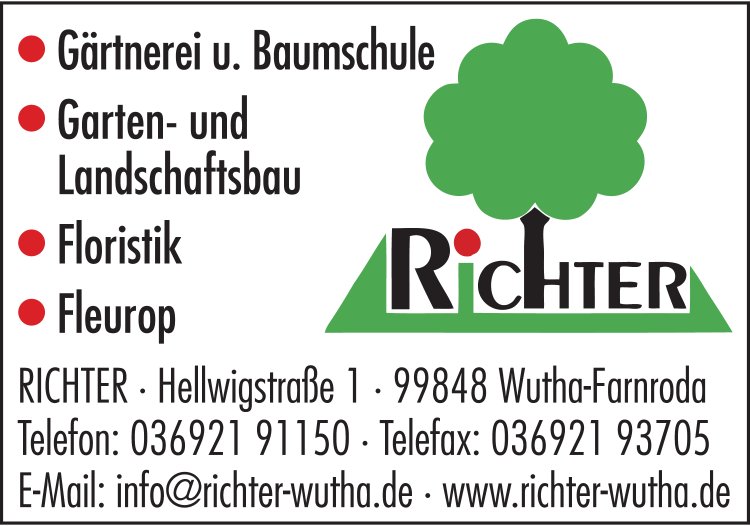 Sie sind auf der Suche nach Richter Gartenbau in Wutha-Farnroda? Das Telefonbuch hilft weiter: Dort finden Sie Angaben wie die Adresse und die Öffnungszeiten. Um zu Richter Gartenbau zu kommen, können Sie einfach den praktischen Routenplaner nutzen: Er zeigt Ihnen nicht nur die schnellste Anfahrtsstrecke, sondern mit der Funktion "Bahn/Bus" können Sie sich die beste Verbindung mit den öffentlichen Verkehrsmitteln zu Richter Gartenbau in Wutha-Farnroda anzeigen lassen. Schauen Sie am besten gleich nach Verbindungen innerhalb der Öffnungszeiten. Übrigens: Sie können die Adresse auch als VCF-Datei für Ihr digitales Adressbuch speichern, so dass Sie diese gleich parat haben für Ihren nächsten Besuch bei Richter Gartenbau in Wutha-Farnroda. Und Sie können diese sogar per Mail oder SMS an Ihre Freunde oder Ihre Bekannten versenden, wenn Sie Richter Gartenbau weiterempfehlen möchten.